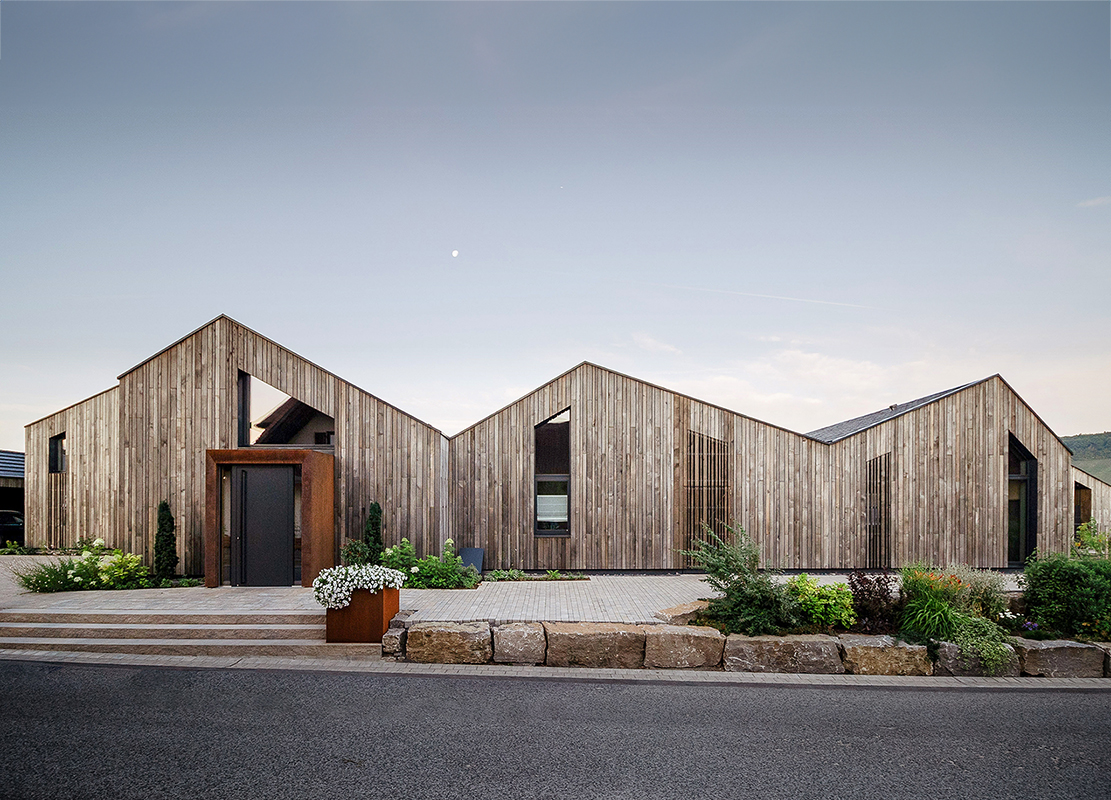Die neuen Gebäude werden gegenüber der Bestandsgebäude inmitten eines Weinfeldes in die Kulturlandschaft eingefügt. Man erreicht Wohnhaus und Vinothek über einen kleinen Baumplatz. Das gesamte Ensemble erstreckt sich unter vier Satteldächern , die sich massstäblich der dörflichen Umgebung anpassen.