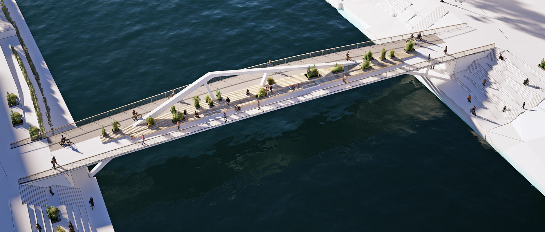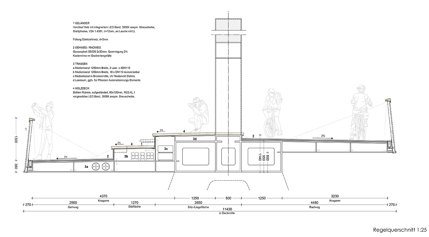 Barrierefreiheit wird dabei selbstverständlich mitgedacht: Fußgänger und mobilitätseingeschränkte Menschen profitieren von durchgängig flachen Übergängen und klaren Wegführungen. Für Radfahrende wird eine leicht geneigte Rampe angeboten, die ein dynamisches Queren ermöglicht und gleichzeitig einen erhöhten Ausblick über den zentralen Aufenthaltsraum hinweg schafft. Erst die Kombination dieser Höhenstaffelung mit einem präzise geführten Tragwerk ermöglicht ein leistungsfähiges Brückendeck, das alle Anforderungen an Statik, Barrierefreiheit und städtische Aufenthaltsqualität vereint – bei gleichzeitiger Einhaltung des notwendigen Lichtraumprofils.